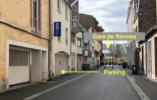 Les photos vous fournissent toutes les indications (place de parking, distance / sortie Nord de la Gare de Rennes, entrée de la rue Jean-Marie Duhamel et du parking).